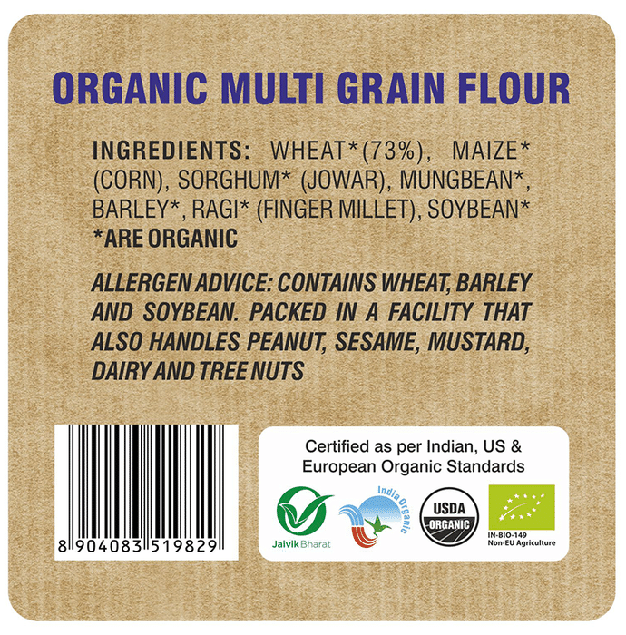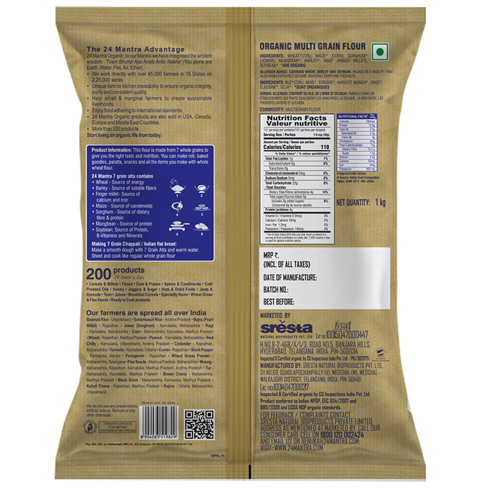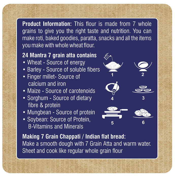 24 Mantra Organic 7 Grain Atta is made from organic whole grains which are perfectly blended ground and made into flour which can be made into tasty fluffy and soft rotis. The grains used in this atta are organically cultivated by Indian farmers. This multigrain atta is a unique blend of cereals millets and pulses like wheat maize sorghum mungbean barley finger millet (ragi) and soybean. Each of the components adds improves the nutrition value and the taste.