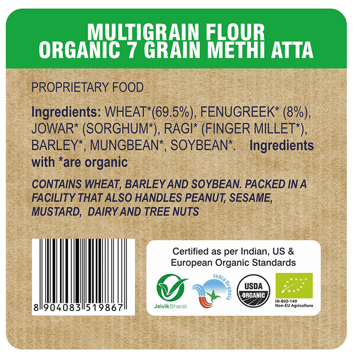 24 Mantra Organic Methi Atta is made from organic cultivated whole grains that are finely grounded and made into flour for consumption. The flour can be used to make dough for rotis which is a stable Indian food. This atta is a unique blend of cereals millets and pulses like wheat maize sorghum mungbean barley finger millet (ragi) and soybean. Each of the components adds improves the nutrition value and the taste.