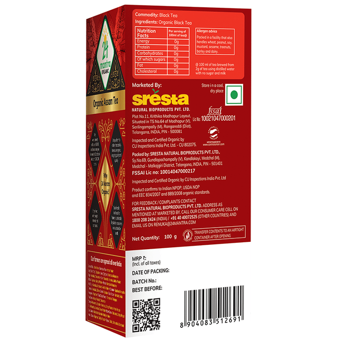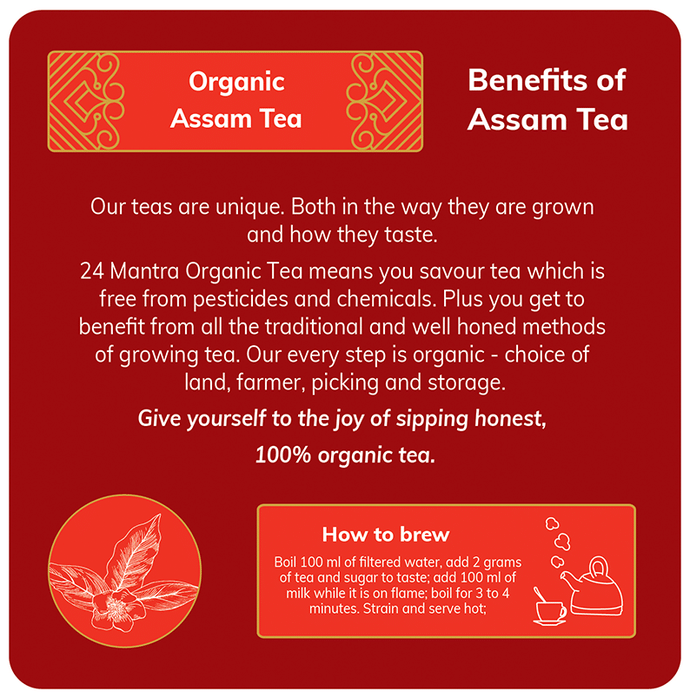 24 Mantra Organic Assam Tea Tea or “Chai” is one of the most popular beverages consumed worldwide. This tea is cultivated in the Assam valley using organic farming techniques without the use of harmful chemical insecticides and pesticides. It is rich in flavonoids. This tea has a rich supply of plant compounds that may boost immunity.