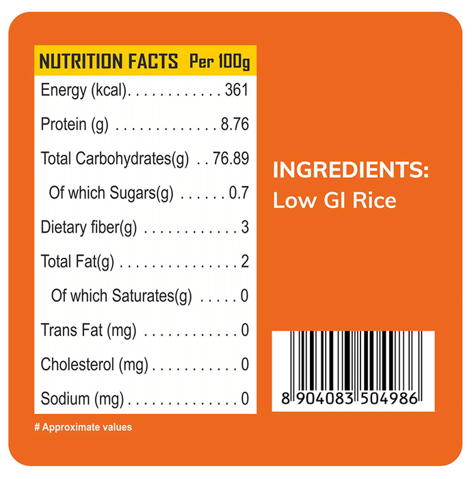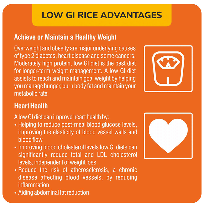 It contains natural anti-inflammatory compounds and is gluten free|Improve the health of the nervous and provides energy to the body|Helps in the prevention of weight gain and aids in weight loss|Low GI rice has diuretic and digestive qualities that help in relieving constipation