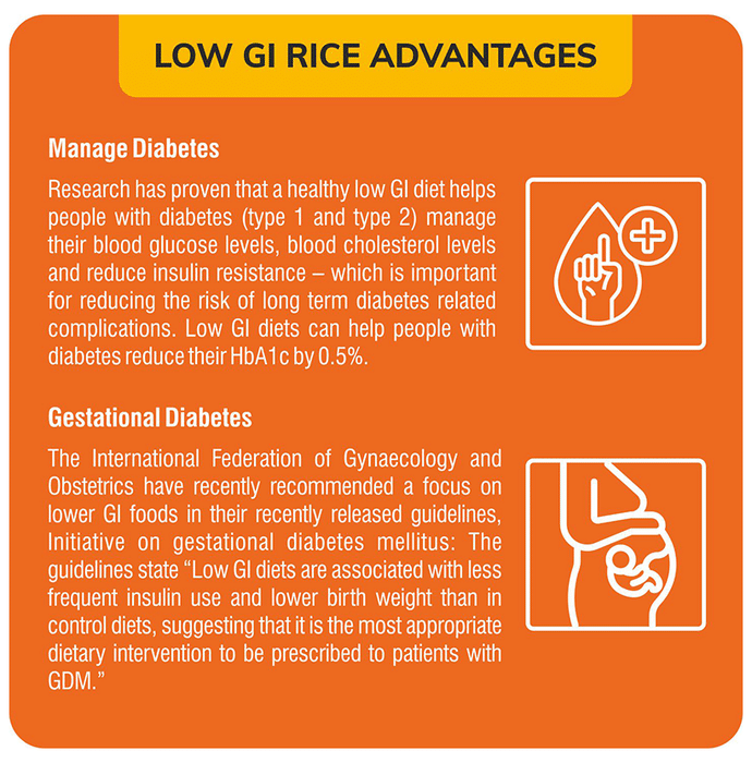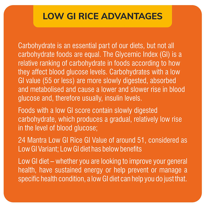24 Mantra Organic Low GI Rice rice is organically cultivated without the use of chemical pesticides and insecticides. Consuming this rice may have additional health benefits for those with high blood glucose levels. This helps in the prevention of weight gain and aids weight loss.