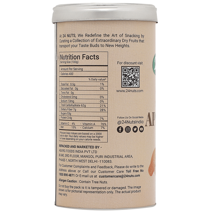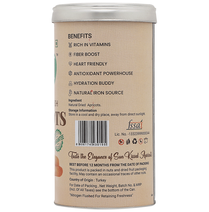 24 Nuts Hand Picked Dried Turkish Apricots are succulent delicacies sourced from the lush orchards of Turkey. These apricots are abundant in multivitamins and serve as a nourishing snack with a delicious taste. They are easy to incorporate into your daily lifestyle. This product has tin packaging and contains nitrogen gas for increased shelf life.