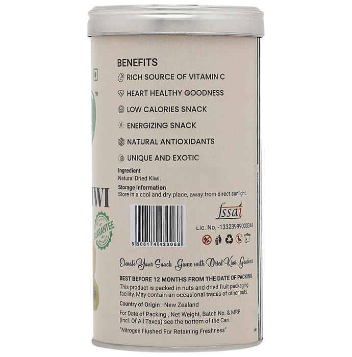 Dried kiwi is a good source of protective antioxidants and immunity-boosting vitamins|Enjoy them as a healthy snack or dip them in chocolate for a real treat|This tin packaging contains nitrogen gas for an increased shelf life of dried kiwi fruit|It is a low-calorie snack that serves as a rich source of vitamin C