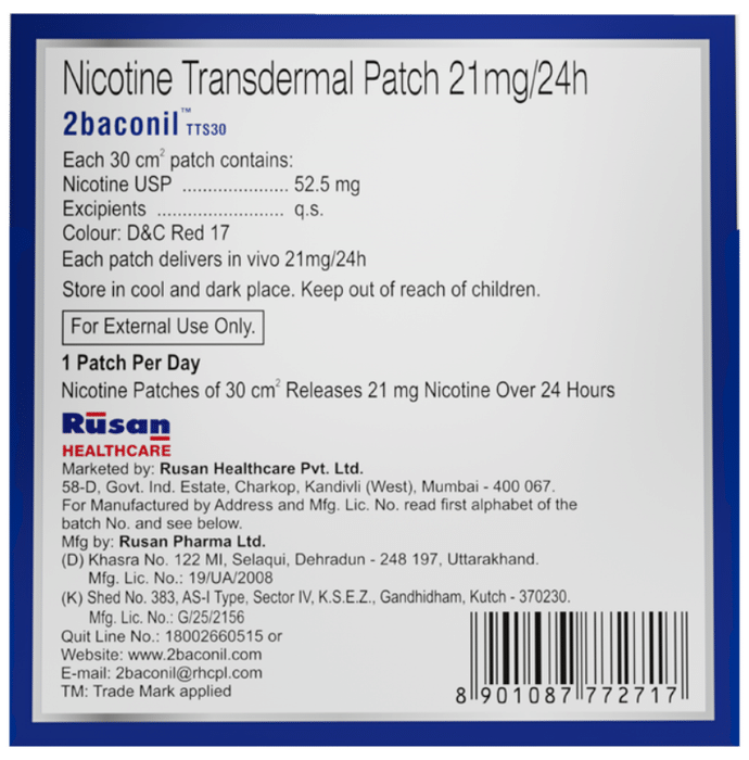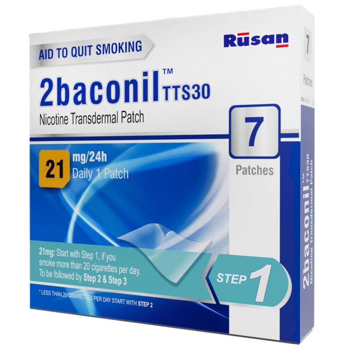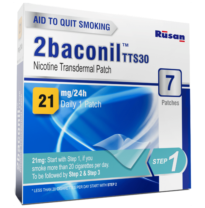 2Baconil 21mg Nicotine Patch is prescribed for smoking cessation as it aids in quitting smoking. It is a form of NRT which is used in Tobacco Cessation (Stop Smoking Programs). It reduces withdrawal symptoms allowing the smoker to focus on the psychological aspects of quitting. A unique patch with Smart TimeRelease Technology that helps prevent the urge to smoke all day long.