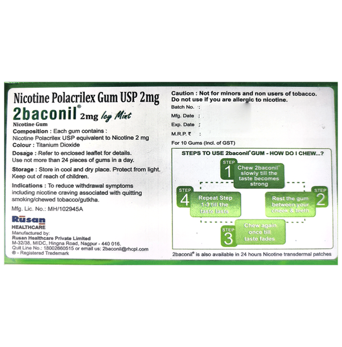 2baconil 2mg Nicotine Gum 2mg is a form of nicotine replacement therapy which is used in tobacco cessation (Stop Smoking Programs). The 2baconil 2mg nicotine gum will help you to control your withdrawal symptoms/cravings for smoking chewing gutka and other tobacco products. The gum will help you gradually bring down your addiction over a period of time.