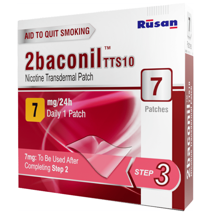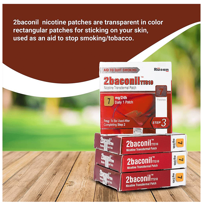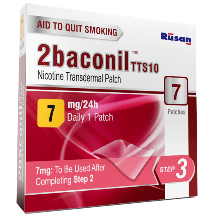 2baconil 7mg Nicotine Patch Step 3 is used as a nicotine replacement therapy (NRT) to help smokers quit smoking. The patch when placed on the body gradually releases nicotine which helps to curb the craving for cigarettes and reduces withdrawal symptoms such as irritability anxiety and restlessness. Step 3 is the final phase of a three-step program and each patch has a 7mg dose of nicotine. This step is typically used after completing steps 1 and 2 which have higher doses of nicotine.