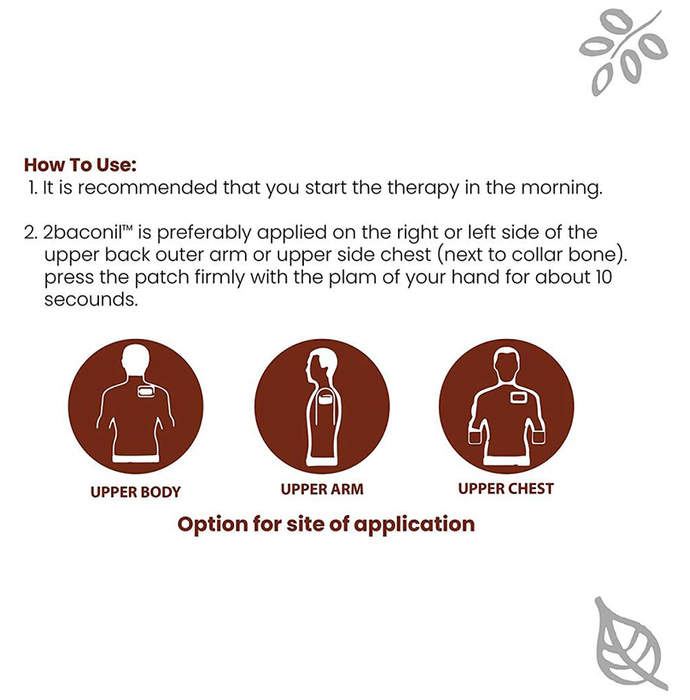 It is recommended that you start the therapy in the morning|2baconil is preferably applied on the right or left side of the upper back outer arm or upper side chest (next to collar bone)|Press the patch firmly with the palm of your hand for about 10 seconds