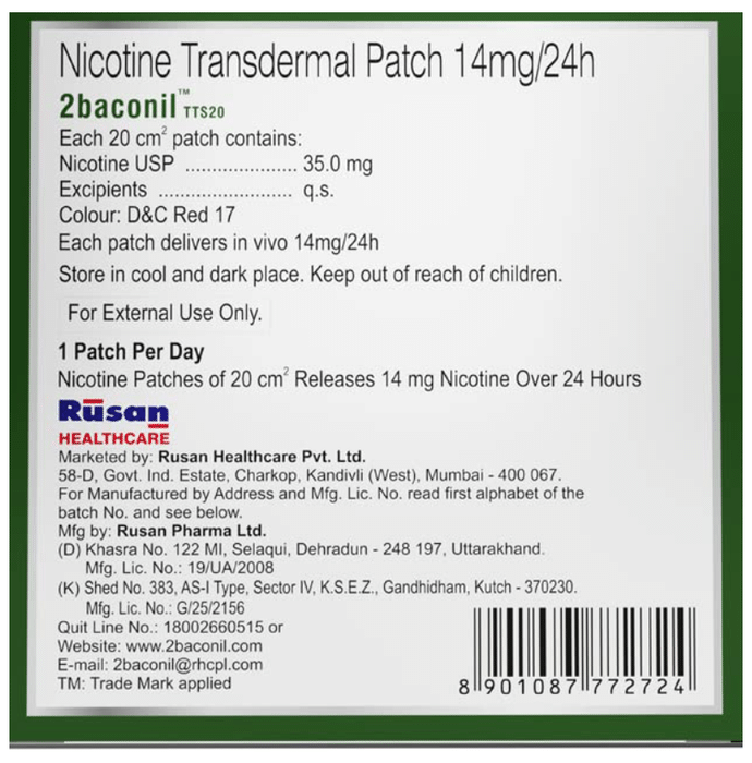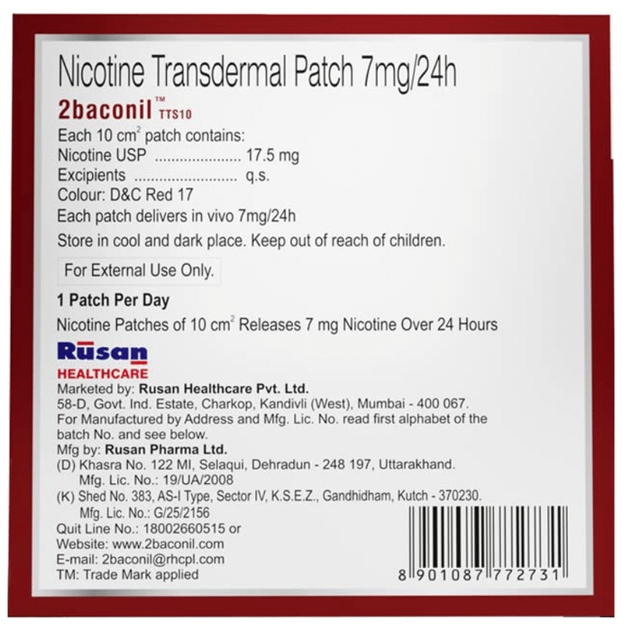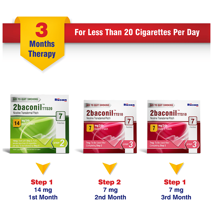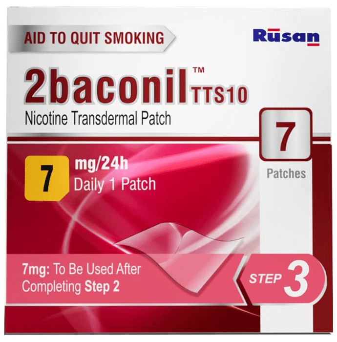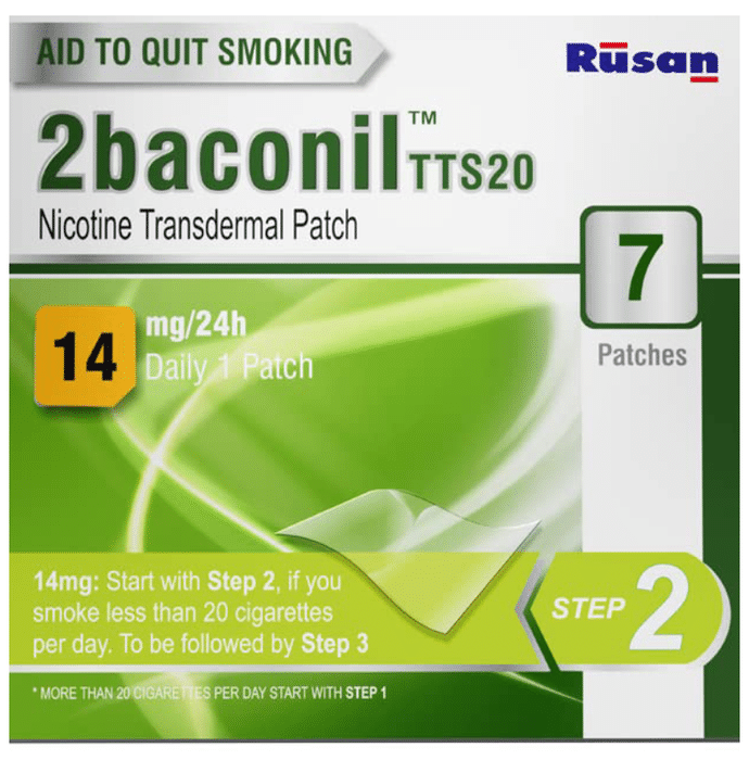 2baconil 14mg Nicotine Transdermal Patch Step 2 (Rusan Pharma Ltd)2baconil 14mg Nicotine Patch helps you to quit smoking using the principle of NRT (Nicotine Replacement Therapy). The patch when placed on your body gradually provides a measured dose of harmless nicotine through the skin over a period of 24 hours. As the nicotine doses are lowered over a course of 12 weeks the tobacco users have weaned off nicotine slowly & steadily minimizing the withdrawal symptoms. It is a unique patch with smart time-release technology that helps in preventing the urge to smoke all day long. It helps in supporting you through your day by delivering remedial nicotine via the patch’s specially designed layers. This technology ensures a steady and all-day release so that the nicotine in the patch will not be delivered all at once.Key Ingredient:NicotineKey Benefits:Provides a steady & continuous release using smart time-release technologyHelps in reducing the urge to smoke or chew tobaccoIt is convenient easy to use and applyIncreases the chances to curb morning cravingsHas a higher patient complianceDirection For UseIt can be preferably applied on the right or left the side of the upper back chest arm. Change the application site of the patch every day. Use only one patch a day preferably in the morning. Apply the patch on the dry clean and non-hairy portion of the body. Press the patch with the palm of your hand for about 10 seconds so that it adheres to the body well.First you need to choose the right strength for you. Since different smokers are used to different levels of nicotine. Depending on how many cigarettes you smoke each day you’ll start at either option A (20 & more cigarettes) or option B (less than 20 cigarettes).Option A is for people who smoke more than 20 cigarettes per day.Step 1 take 21 Mg for the duration of (Week 1-4 )Step 2- take 14 Mg for the duration of (Week 5-8 )Step 3- take7 Mg for the duration of (Week 9-12)Option B is for people who smoke less than 20 cigarettes per day.Step 1 take 14 Mg for the duration of (Week 1-4 )Step 2 take 7 Mg for the duration of ( Week 5-8 )Step 3- take 7 mg for the duration of (Week 9-12)Safety Information:Read the label carefully before useKeep away from childrenDo not exceed the recommended dosageUse under medical supervisionStore in a clean and dry place2baconil 7mg Nicotine Patch Step 3 (Rusan Pharma Ltd)2Baconil 7mg Nicotine Patch helps you to quit smoking using the principle of NRT (Nicotine Replacement Therapy). The patch when placed on the body gradually provides a measured dose of harmless nicotine through the skin over the period of 24 hr. As the nicotine doses are lowered over a course of 12 weeks the tobacco users have weaned off nicotine slowly & steadily minimizing the withdrawal symptoms. 2Baconil patch supports you through your day by delivering remedial nicotine via the patch’s specially designed layers. This technology ensures a steady and all-day release so that the nicotine in the patch will not be delivered all at once. Uses:It is a unique patch with smart time-release technology that helps prevent the urge to smoke all day long.Product Specification and Features:It will give a steady & continuous release using smart time-release technologyUnique patch with Smart time-release technology that helps prevent the urge to smoke all day longConvenient easy to use & applyIncrease the chances to curb morning cravingsHigher patient complianceDepending on how many cigarettes you smoke each day you’ll start at either option A (20 & more cigarettes) or option B (less than 20 cigarettes)Option A: More than 20 cigarettes per day-Step 1-: 21 Mg (Week 1-4 )Step 2-: 14 Mg ( Week 5-8 )Step 3-: 7 mg (Week 9-12) Option B] Less than 20 cigarettes per day-Step 1-: 14 Mg (Week 1-4 )Step 2-: 7 Mg ( Week 5-8 )Step 3-: 7 mg (Week 9-12) Directions For Use:2Baconil Tts Patch preferably applied on the right or left the side of the upper back chest armChange the application site of the patch every dayUse only one patch a day preferably in the morningApply the patch on the dry clean and non-hairy portion of the bodyPress the patch with the palm of your hand for about 10 seconds so that it adheres to the body well. Safety Information:Read the label carefully before useKeep out of reach of the childrenStore in a cool dry placeUse under medical supervision