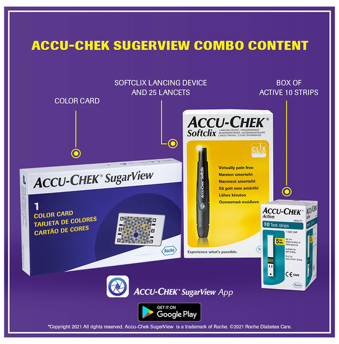 Accu Chek SugarView System Combo Pack comes with an Accu-Chek SugarView System (Mobile Glucose Monitoring) with Accu-Chek SugarView Colour Card Accu-Chek Active 10 Test Strips Softclix Lancing Device Kit. The Accu-Chek SugarView app enables people with type 2 diabetes* to self-test their blood glucose range using their smartphone (Android) camera without the requirement of any meter. Its results are delivered using six colour ranges together with suggestions about how to enjoy a healthier lifestyle on the go.*The intended users are adults (≥ 18 years of age) with pre-diabetes and adults with type 2 diabetes on diet and/or non-insulin anti-diabetics (NIADs). The app is primarily intended to be used by the user but a third party (e.g. relative caregiver) may also employ it. It is not for patients on insulin therapy or hypo-inducing NIADs (e.g. Sulfonylureas). The BG range displayed by the Accu-Chek SugarView app must not be used for insulin dose or therapy adjustments.Uses:The Accu-Chek Kit is handy in self-checking blood glucose levelsThe Accu-Chek SugarView app is developed for people with pre-diabetes and type 2 diabetes not using sulfonylurea or insulinThe Accu-Chek SugarView app helps you get going with Mobile Glucose MonitoringProduct Specifications and Features:It is an easy to use device and softwareThe combo comes with Accu-Chek SugarView System (Mobile Glucose Monitoring) with Accu-Chek SugarView Colour Card Accu-Chek Active 10 Test Strips Softclix Lancing Device KitIt accompanies you through each step of checking your blood glucose rangeIt gives a guided testing through colour-coded immediate lifestyle suggestionsIt allows you to integrate self-testing your blood glucose range into your routine even when you're on the goIt can translate your blood glucose range test results into immediate informationIts colour-coded range indicator shows whether you're on targetIt can track your progress and allows you to share a summary of your blood glucose range results with your doctorIts suggests targeted activities and on how to stay in rangeDirections For Use:You need a test strip and a lancing device with a lancet inserted to perform a blood glucose testWash your hands and clean the surface to be used firstGet ready and prepare the components before startingWith the black side of the colour card facing upwards insert the test strip into the colour card with the square green test area facing upwardsTake two photos of the test strip attached to the colour card. For the first photo do not apply blood drop yetApply a blood drop onto the test strip then take the second photoMake sure you follow the timing and steps in the appSafety Instructions:Keep in a cold and dry placeRead the label carefully before useKeep out of reach of the children