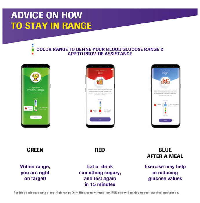Easy to use device and software|Accompanies you through each step of checking your blood glucose range|Gives guided testing through colour-coded immediate lifestyle suggestions|Allows you to integrate self-testing your blood glucose range into your routine|Can be used anywhere at any time|Translates your blood glucose range test results into immediate information|Suggests targeted activities and on how to stay in range