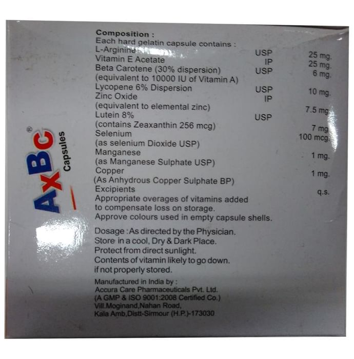 Axbc Capsule is a health supplement with potent antioxidants like l-arginine vitamin E beta carotene lycopene and lutein which helps eliminate damage-causing free radicals. It also contains minerals like selenium zinc manganese and copper which aids in regulating blood pressure level and improving immunity and energy levels.