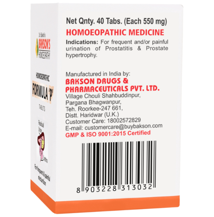 Bakson's Homoeopathic Formula P Tablet is a combination of several clinically tried potentized homoeopathic medicines which give relief in problems of prostate. The medicines in microdoses promote normal functioning of gland without side effects.