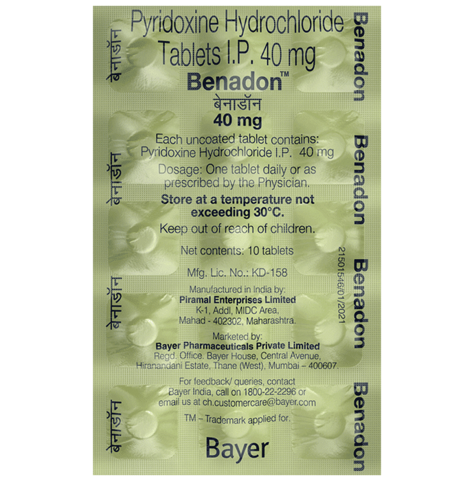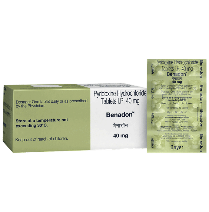Benadon 40mg Tablet is a vitamin supplement containing vitamin B6 that replenishes the vitamin B6 requirement or deficiency in the body. It helps plays a role in improving energy levels aids in the formation of red blood cells and boosts immunity and nervous system health.