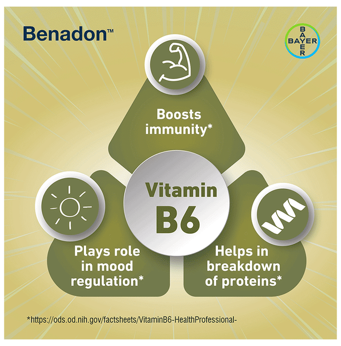 Taken for keeping the nervous system and immune system healthy|Benadon tablet is required by the body for utilization of energy in the foods you eat production of red blood cells and proper functioning of the nervous system|It is used to treat and prevent vitamin B6 deficiency resulting from poor diet certain medications and some medical conditions