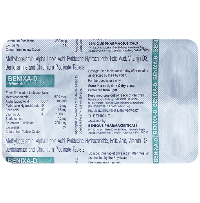 Benixa -D Tablet is like a vitamin that is found in every cell of the body. Body cells use it to produce energy for cell growth and maintenance. It also acts as an antioxidant that protects the body from various damaging effects of oxidising molecules.