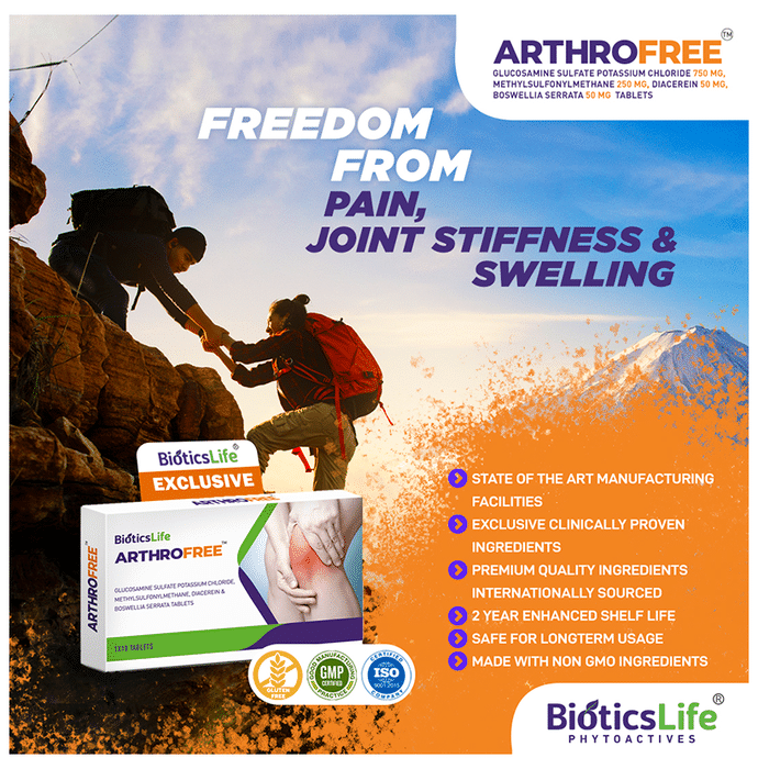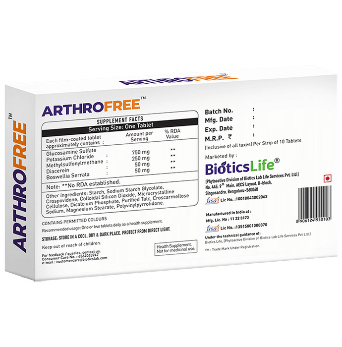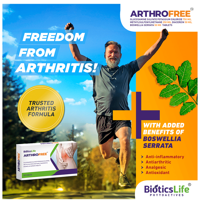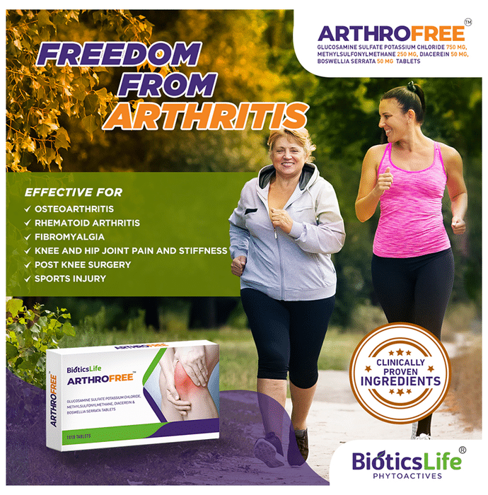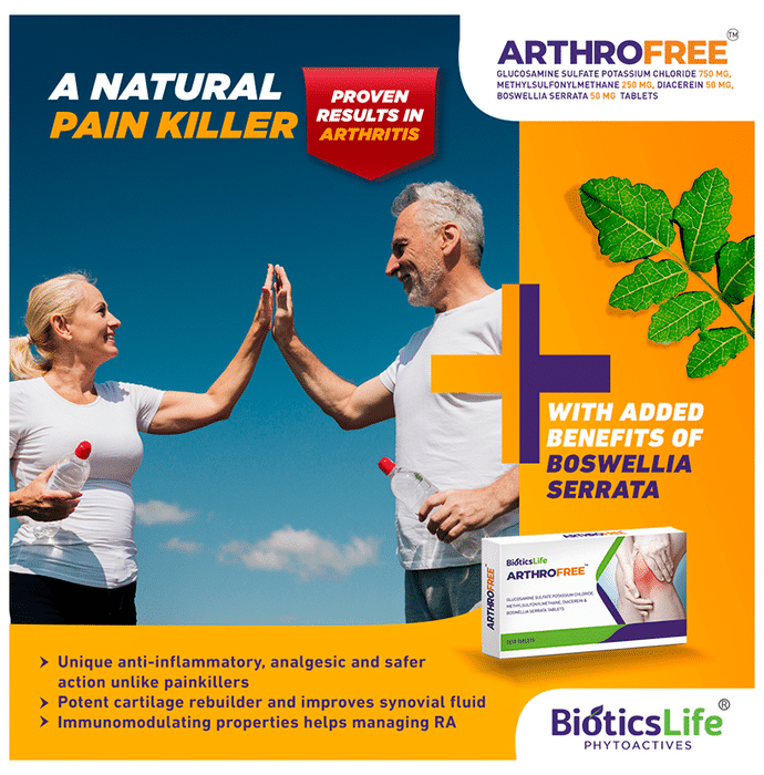 Arthrofree is a natural pain killer specifically targeting various types of arthritis with proven results in swelling joint stiffness. Arthrofree minimizes degenerative changes of bones muscles joint supporting tissues like cartilage tendons ligaments etc. Protect your body from arthritis and regain your freedom to move naturally!Key Ingredients of BioticsLife Arthrofree Tablet:Glucosamine Sulfate Potassium Chloride 750mgMethylsulfonylmethane 250mgDiacerein 50 mgBoswellia Serrata 50mgKey Benefits of BioticsLife Arthrofree Tablet:It is a natural painkiller specifically targeting various types of arthritisEffective in relieving pain swelling and musculoskeletal degenerationHelpful in arresting degenerative changes of bones muscles and joint supporting tissues like cartilage tendons and ligamentsDirections For Use:1-2 tablets per day or as directed by the physician.