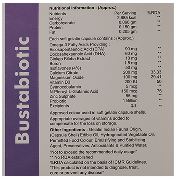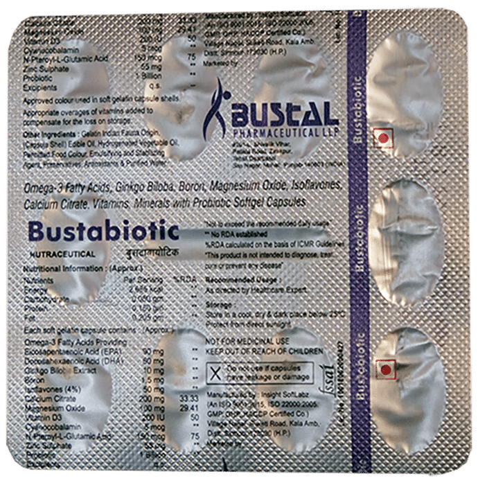 Bustabiotic Softgel Capsule contains omega 3 fatty acids ginkgo biloba boron magnesium oxide calcium citrate vitamins and minerals with probiotics.