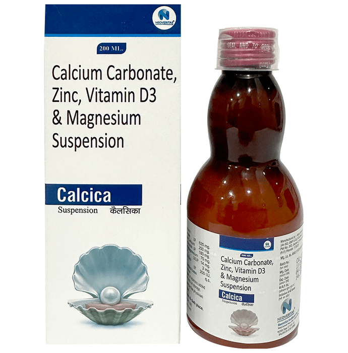 Calcica Suspension is a bone and joint health supplement formulated with calcium and vitamin D3 with minerals like zinc and magnesium. Calcium is essential for bone and teeth growth and strength. Vitamin D3 enhances calcium absorption in the body. Magnesium can help increase energy levels and zinc boosts immune function.