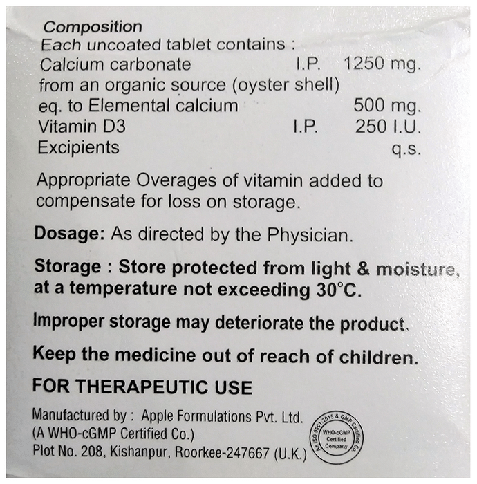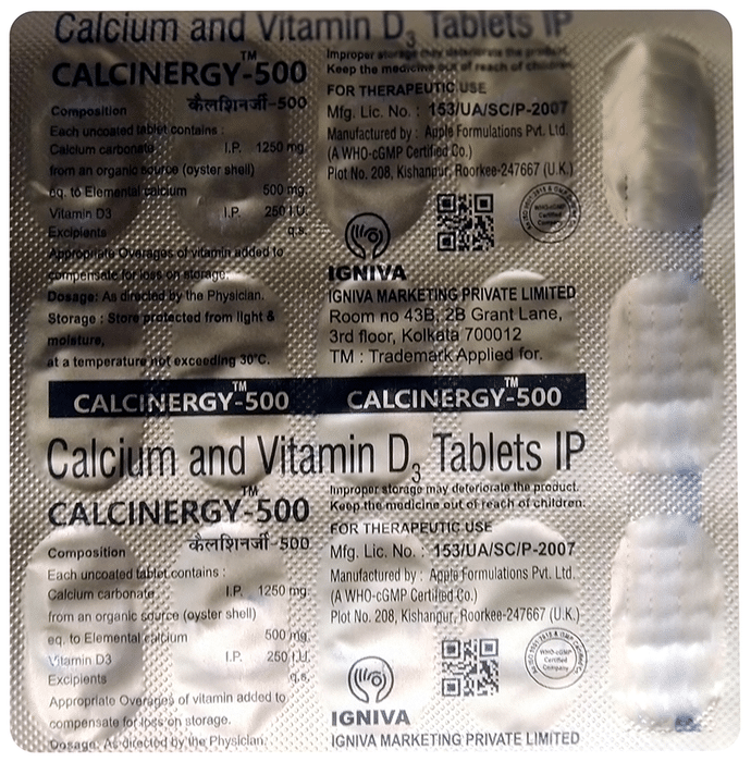 Calcinergy 500 Tablet contains vitamin D3 and calcium that contribute to the well-being of your body especially your skeleton structure and muscles. It helps in the overall development and provides nourishment to the bones. It promotes healthy bones and may address minor bone issues.