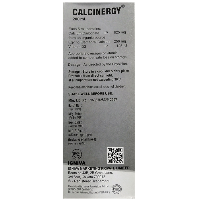 Calcinergy Oral Suspension is a combination of calcium and vitamin D3 syrup formulation. It helps combat calcium and vitamin D3 deficiencies necessary for healthy bones and teeth and supports the body to stay fit.
