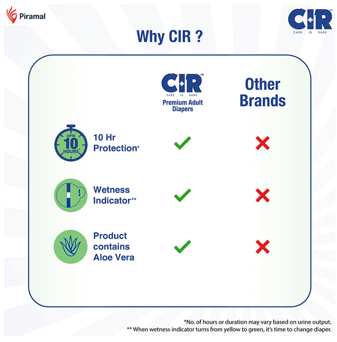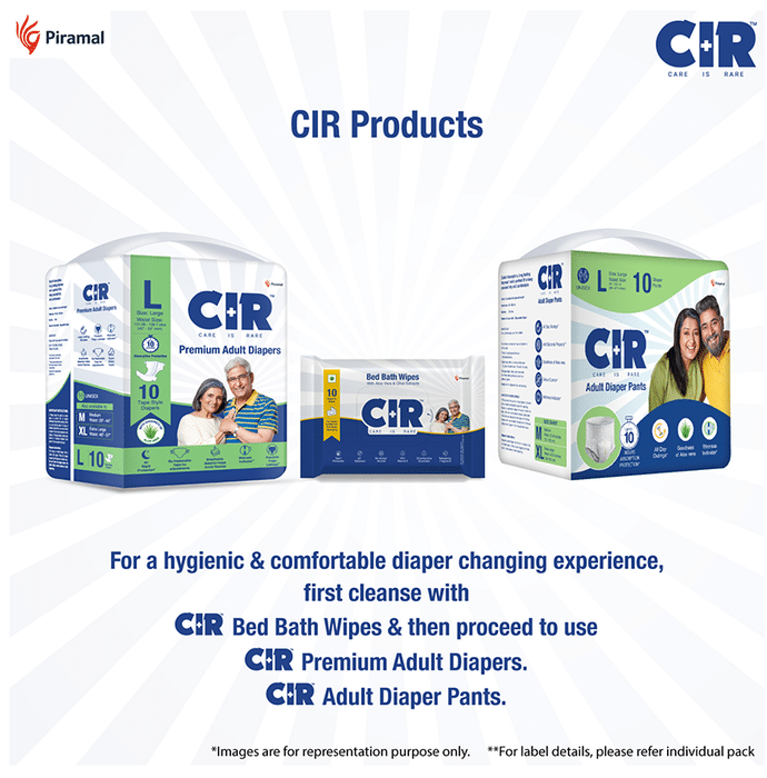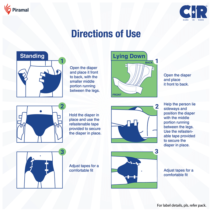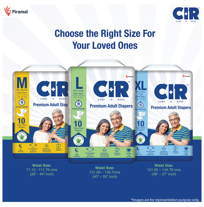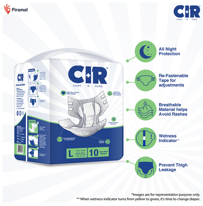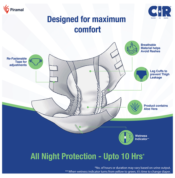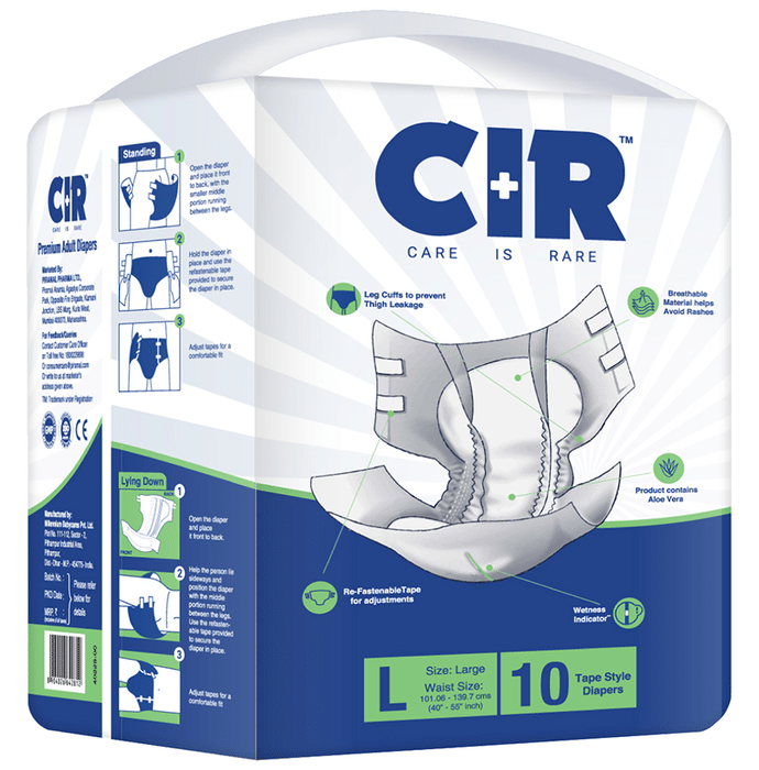 CIR Premium Adult Diaper XL comes with an extremely absorbent antibacterial gel core that quickly absorbs liquid. Friends Adult Diapers provide triple odour leak and moisture protection so you can go about your day without fear.Uses: Helps in maintaining personal hygiene by absorbing urine and discharge.Product Specification and Features:Product Dimensions: 99 x 54 x 25.3 cm; 920 gIt has a highly absorbent anti-bacterial core that prevents rashes and infectionsProvides protection and ensures a good night's sleep free from any disturbancesLeak Guards avoid spills or leakages from the sidesIt is lightweight and prevents odour leaks and soarsGood to know: Comes with wetness indicator superior absorbency and leak proof technologyAvailable Sizes:LargeMediumXLSuitable For: UnisexAbsorption Capacity:Super absorbent anti-bacterial core ensures faster absorption and prevents rashes and infectionDirections For Use:Read the label carefully before use.Safety Information:Read the label carefully before useStore in a cool and dry place away from direct sunlightKeep out of reach of children