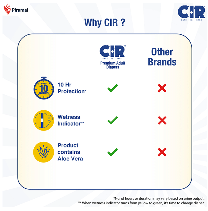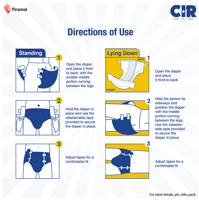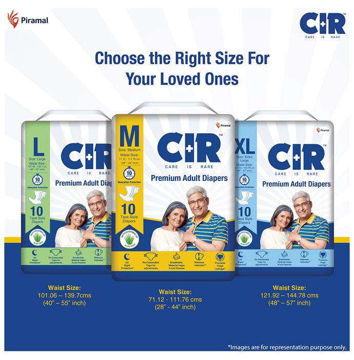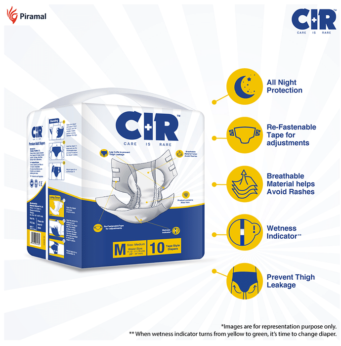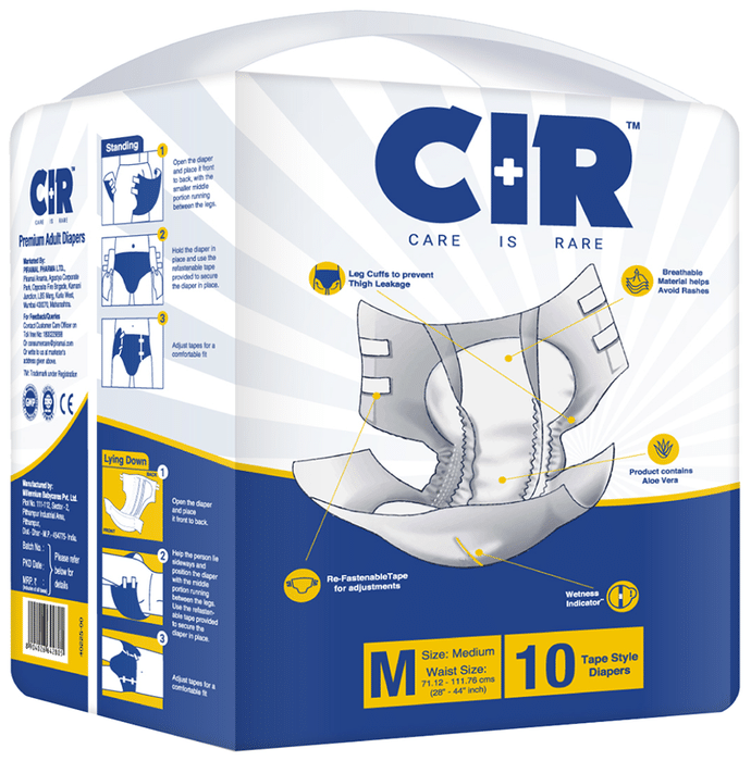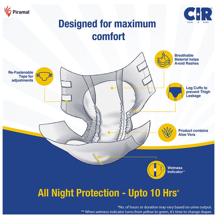 CIR Premium Adult Diaper XL comes with an extremely absorbent antibacterial gel core that quickly absorbs liquid. Friends Adult Diapers provide triple odour leak and moisture protection so you can go about your day without fear.Uses: Helps in maintaining personal hygiene by absorbing urine and discharge.Product Specification and Features:Product Dimensions: 99 x 54 x 25.3 cm; 920 gIt has a highly absorbent anti-bacterial core that prevents rashes and infectionsProvides protection and ensures a good night's sleep free from any disturbancesLeak Guards avoid spills or leakages from the sidesIt is lightweight and prevents odour leaks and soarsGood to know: Comes with wetness indicator superior absorbency and leak proof technologyAvailable Sizes:LargeMediumXLSuitable For: UnisexAbsorption Capacity:Super absorbent anti-bacterial core ensures faster absorption and prevents rashes and infectionDirections For Use:Read the label carefully before use.Safety Information:Read the label carefully before useStore in a cool and dry place away from direct sunlightKeep out of reach of children