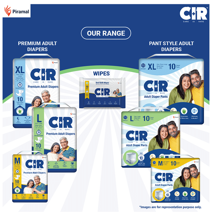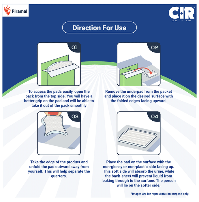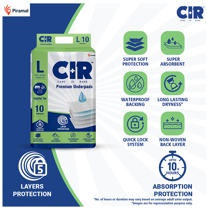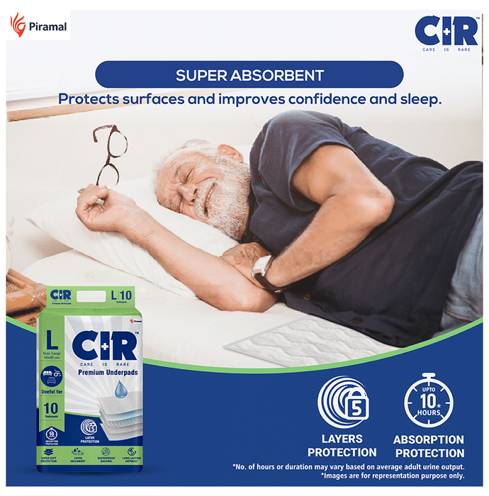 CIR Premium UnderpadsCIR Premium Underpads are an effective solution to incontinence for your loved ones. The underpads are made of super soft fabric that gives cloth-like comfort long-lasting dryness and a waterproof back sheet that protects surfaces (bed sofa chair etc.) from bladder issues and improves confidence and sleep. CIR Premium Underpads have 5-layer protection with 10 hours of absorption protection. The top layer gives cloth-like comfort followed by the non-woven layer with a super absorbent core that gives better core integrity. The 3rd layer of SAP (Super Absorbent Polymer) and Fluff ensures a comfortable dry and clean surface followed by a unique quilted design for quick dispersing of liquid. The final layer of waterproof non-slip back sheet prevents leakage on any surface.Available Sizes:Large: 60x90 cmNumber of Underpads10Uses:CIR Premium Underpads are the go-to solution that provides maximum absorption protection for upto 10 hoursProduct Specifications and Features: CIR premium underpads (5 LAYER) with 10 hours of absorption protection help protect surfaces from bladder issues and improve confidence and sleepThe top layer gives the user a cloth-like comfortIt has a non-woven layer with a super absorbent core that provides better core integritySAP (Super Absorbent polymer) and fluff ensure a comfortable dry and clean surfaceQuick lock system has a unique quilted design that helps in the quick dispersing of liquidsThe final layer of waterproof non-slip back sheet prevents leakage on any surfaceDirections For Use:To access the pads easily open the pack from the top side. You will have a better grip on the pad and will be able to take it out of the pack smoothlyRemove the underpad from the packet and place it on the desired surface with the folded edges facing upwardTake the edge of the product and unfold the pad outward away from yourself. This will help separate the quartersPlace the pad on the surface with the non-glossy or non-plastic side facing up. This soft side will absorb the urine while the back sheet will prevent liquid from leaking through to the surface. The person will lie on the softer sideSafety Information:For single-use onlyFor external use onlyDo not flushDo not reuseWrap the underpad and dispose of it in the waste bin