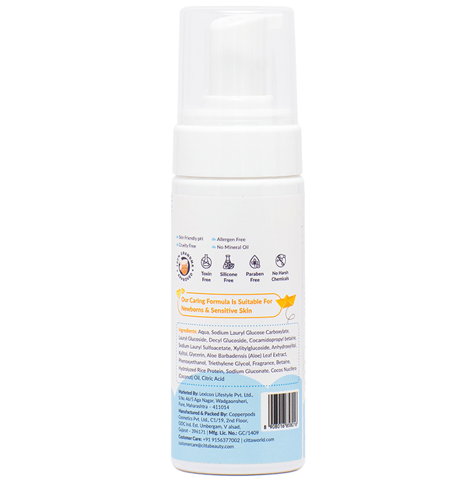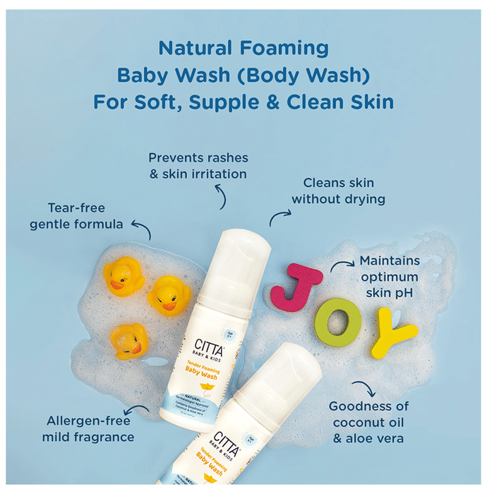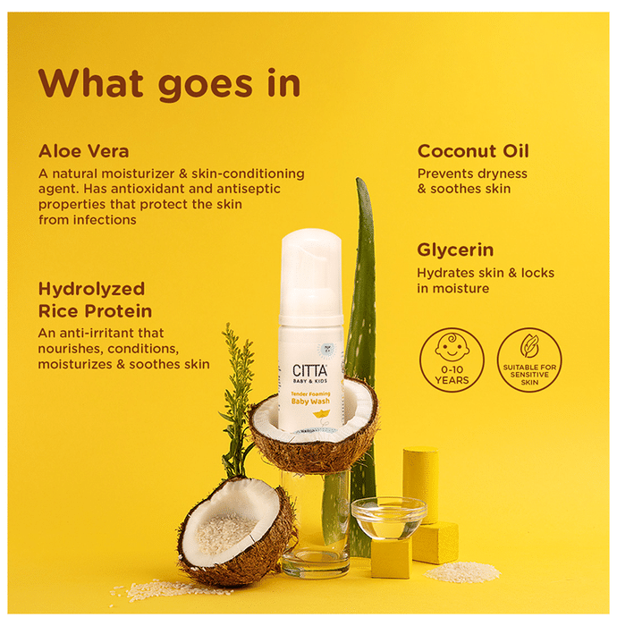 Cita Tender Foaming Baby Wash Dry skin after a bath? Not with CITTA’s Natural Baby Wash. Infused with coconut oil aloe vera and rice protein this kid's body wash for 5 to 10 years newborns and toddlers gently cleanses nourishes and moisturises your little one’s skin while managing rashes. CITTA’s Tender Foaming Baby Body Wash is the safest choice for your little one’s bathtime routine. Naturally protected skin with toxin-free baby products for babies and kids.