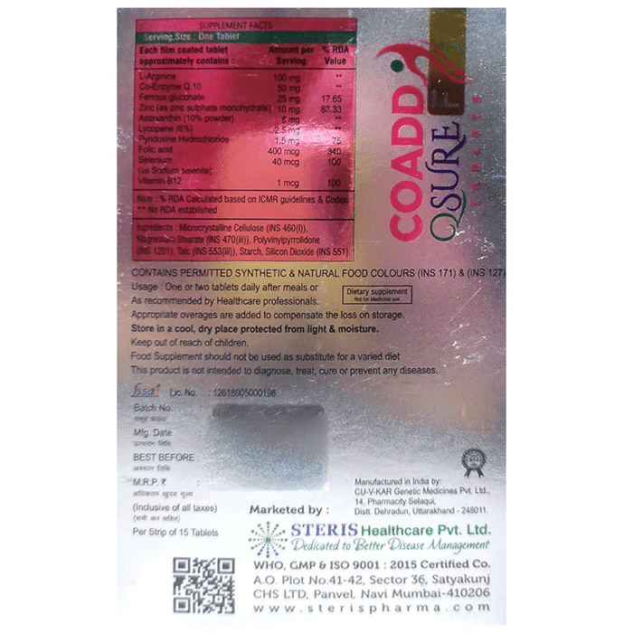 Coadd Qsure F tablet is a nutritional supplement formulated with a potent combination of astaxanthin lycopene zinc selenium L-arginine ferrous gluconate folic acid pyridoxine vitamin B12 and coenzyme Q10. This unique blend is designed to support overall health by providing essential vitamins minerals antioxidants and amino acids. It protects the cells from oxidative damage supports immune function maintains healthy iron levels promotes energy metabolism and supports neurological function.