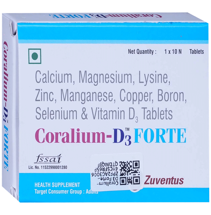 Coralium-D3 Forte Tablet has a balanced mix of calcium carbonate and vitamin D3. Calcium plays a very important role in the body. It is necessary to normalise nerves cells muscle and bone. If there is insufficient calcium in the blood the body will take calcium from bones thereby weakening bones. Vitamin D3 helps to enhance calcium and phosphorus absorption ensuring the overall health of bones and joints.Key Ingredients