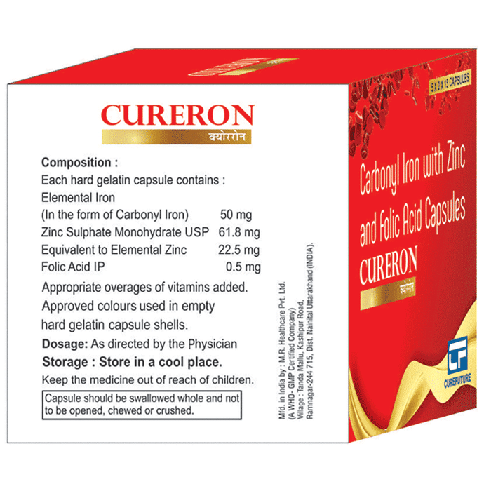 Cureron Capsule helps to replenish the iron stores in your body and corrects iron deficiency that causes anaemia. It plays a vital role in the formation of red blood cells which carry oxygen throughout the body. It is also essential in pregnancy due to its role in the development of the unborn baby's brain and spinal cord. Zinc is a micromineral that provides nutrition.