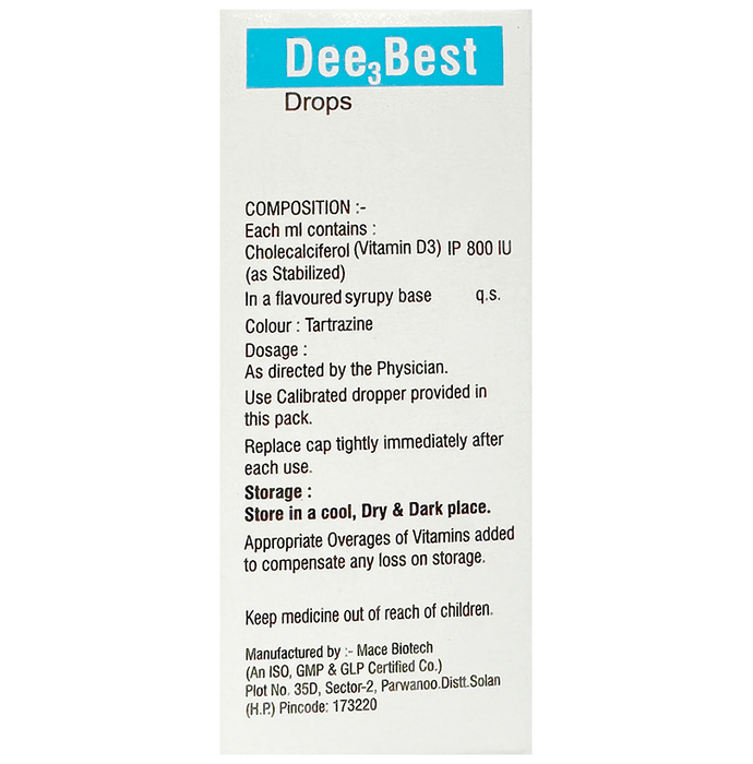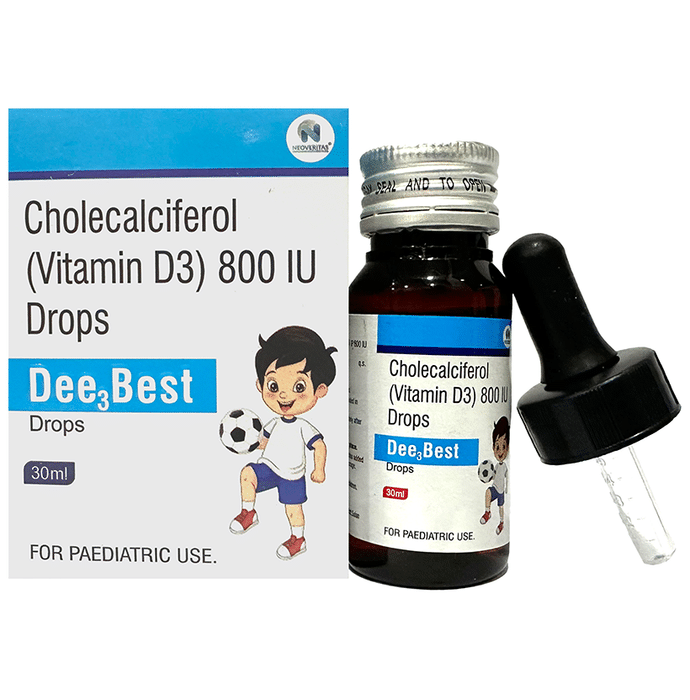Dee3 Best Drop 800IU is formulated to provide vitamin D3 to growing children to help support bone and teeth formation and health. It contains the preferred form of vitamin D as cholecalciferol. It helps check vitamin D deficiency and boosts immunity. It also supports the normal growth and development of the child.