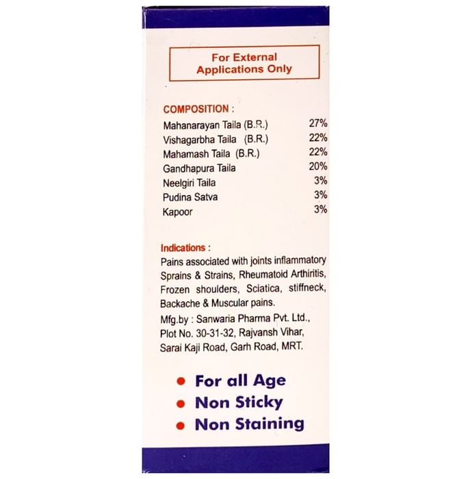 Made from novel herbs which provide relief from body pains stiffness soreness neuro-muscular pains and chronic joint pains|It is useful for sprains arthritic pains knee pain shoulder pain and backache|It aids in dealing with inflammatory joints rheumatoid arthritis and sciatica|Beneficial for frozen shoulder stiff neck backache and muscular pain