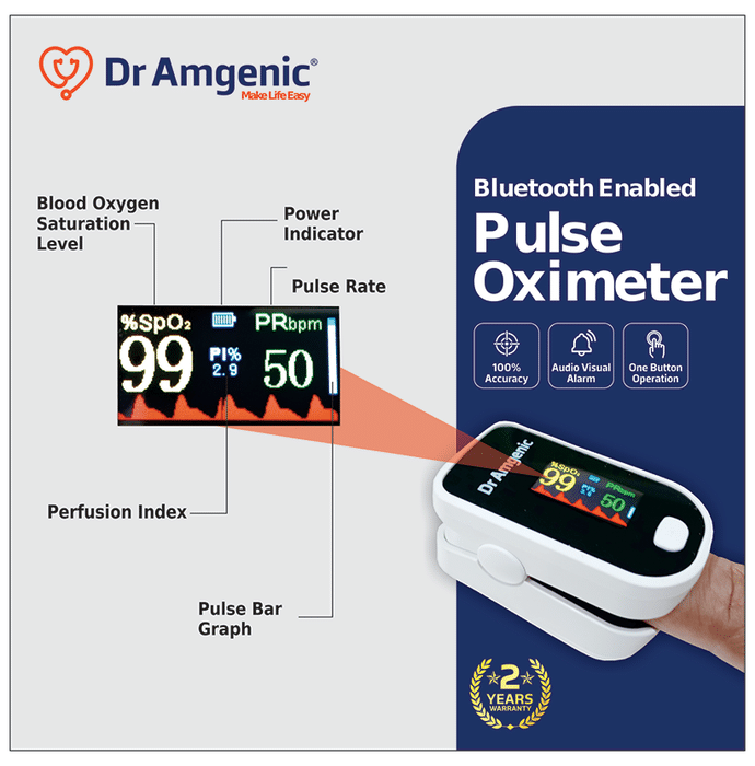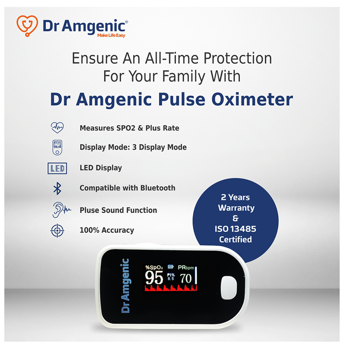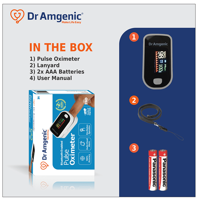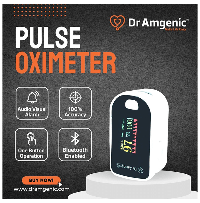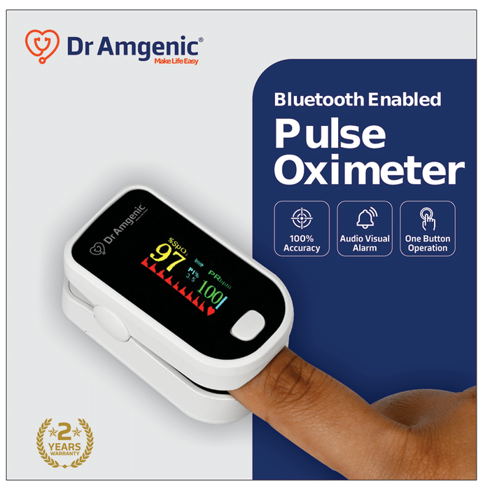 Dr Amgenic Bluetooth Enabled Fingertip Pulse Oximeter is a reliable Oximeter to measure blood oxygen saturation and pulse rate. Based on all digital technology the pulse oximeter is intended for noninvasive spot-check measurement of functional oxygen saturation of arterial haemoglobin (SpO2). Our pulse Oximeter is made in India and has ISO certification. It is Bluetooth enabled and has an audio-visual alarmUses:It is mainly used to measure your body's oxygen saturation pulse and respiration rateProduct Specifications and Features:
