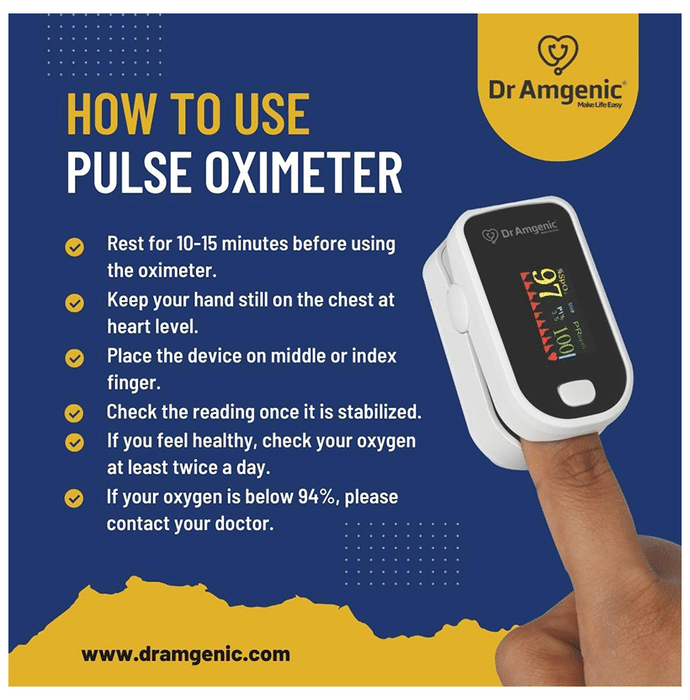 Rest for 25 to 20 minutes before using the oximeter|Keep your hand still on the chest at heart level|Place the device on the middle or index finger|Check the reading once it is staboilized|If you are healthy check your oxygen saturation at least twice a day|If your oxygen level is below 94 percent please get in touch with a doctor