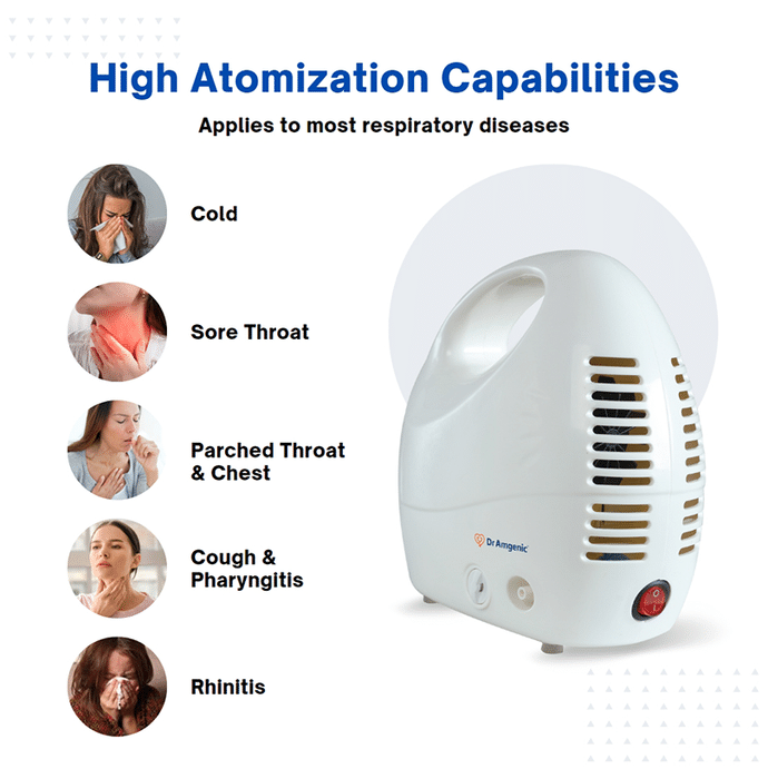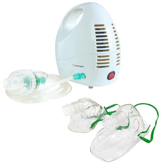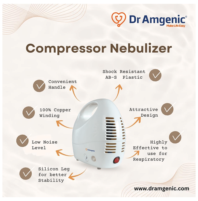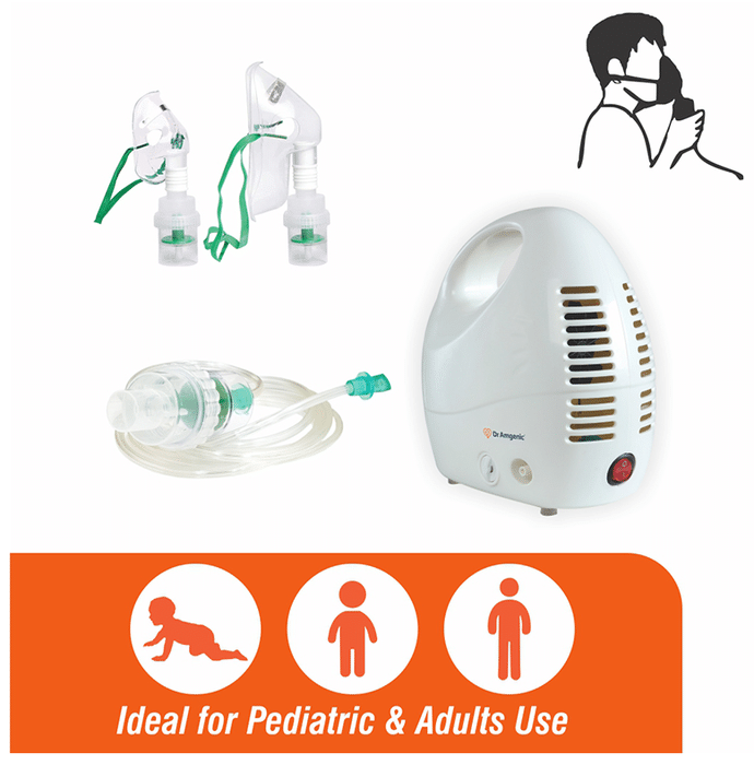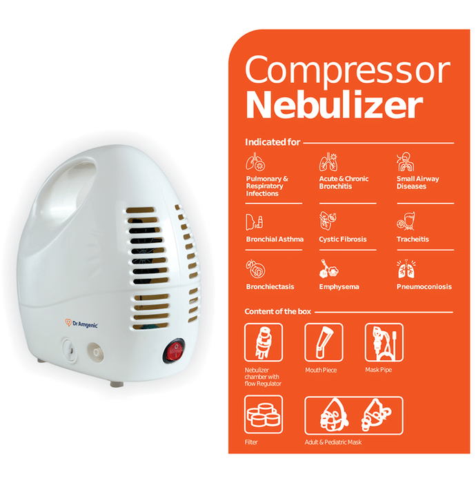 Dr. Amgenic Compressor Handy Nebulizer nebuliser features a durable compressor to provide a consistent flow of medication. It also has an easy-to-use control panel that makes it simple to operate. The nebuliser comes with all the necessary equipment making it easy to take. It helps condition bronchial asthma acute bronchitis chronic bronchitis emphysema etc.It creates a fine mist to allow smaller medication particles to be breathed inefficiently. It is portable lightweight easy to use and clean. It is suitable for both adults and children the small compact design blends stylishly into any space. The package comes with a complete kit with a mouthpiece and child and adult mask so the entire family can use the product. Both comprise a base that holds an air compressor a small container for liquid medicine and a tube that connects the air compressor to the medicine container. Above the medicine container is a mouthpiece or mask you use to inhale the mistUses:It is mainly used to clear congestion from the chest and provide relief in case of acute and chronic bronchitisProduct Specifications and Features: