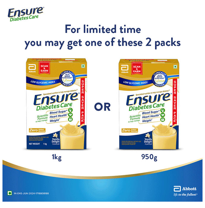 Ensure Diabetes Care Nutrition Powder is a nutritional supplement drink offering a unique scientific formula to assist in managing blood sugar weight and heart health. With 36 essential nutrients including proteins vitamins fibre minerals and MUFA-rich fat blend slow-release carbs it promotes heart health while effectively managing blood glucose. Designed as a complete balanced nutrition for individuals with high blood glucose levels it ensures steady energy throughout the day while helping to regulate blood glucose levels. Additionally this drink provides high protein content supporting muscle health crucial for strength and mobility along with vital vitamins and minerals.
