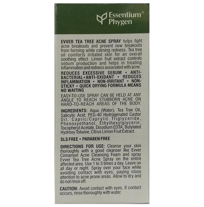 Essentium Phygen Evver Tea Tree Acne Spray can effectively deal with acne and related discomfort. It may provide relief from inflammation itching and irritation of the skin. It can also help reduce the eruption of the skin.