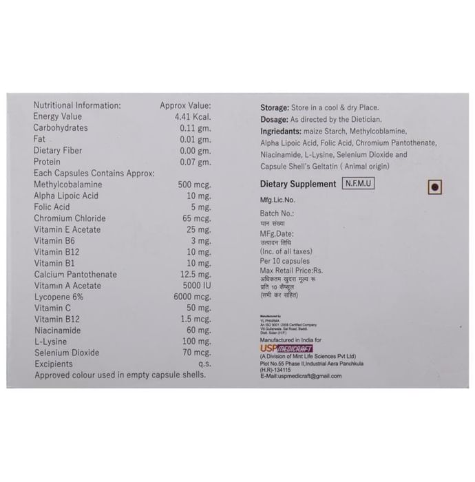 Serves as a source of alpha-lipoic acid that helps to prevent any sort of cell damage and helps to maintain the levels of vitamins C and E| The capsule contains folic acid which ensures that the body does not fall short of platelets and red blood cells| It assists averting the chances of iron deficiency| Methylcobalamine in the capsule helps to avert the chances of low Vitamin B12 which could potentially also lead to Anaemia|