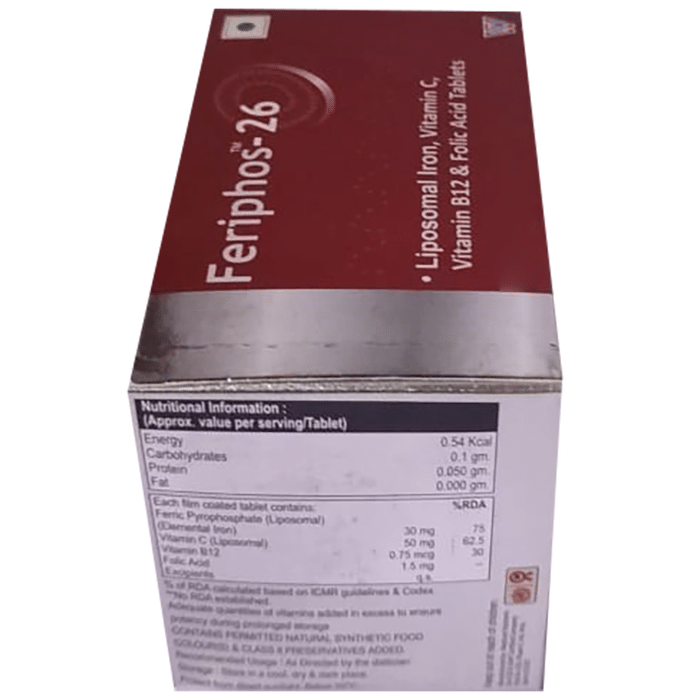 Feriphos 26 Tablet helps in the formation of red blood cell and maintains the overall health of the heart boost immunity and improve the body's wellbeing.Key Features:Liposomal ironVitamin CVitamin B12Folic acidKey Benefits:It aids in the formation of red blood cells and maintains the overall well-being of the bodyIt helps to maintain healthy hair skin nails and overall healthIt boosts immunity and improves the well-being of the bodyIt maintains the overall health of the heart and help to get relief from heart disorderDirections for Use:Use as directed by the physician.Safety Information:Read the label carefully before useKeep away from direct sunlightStore in a cool and dry place