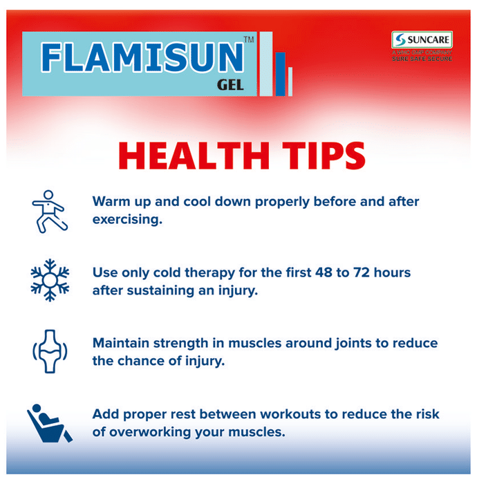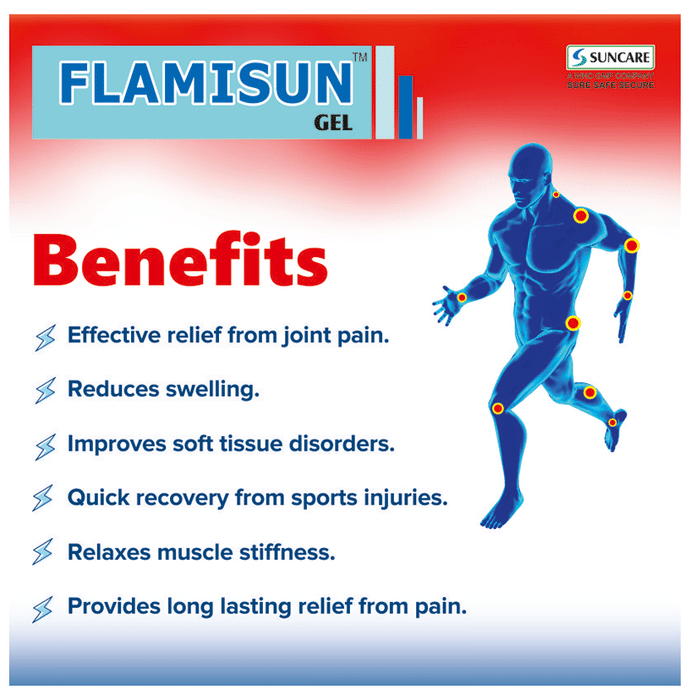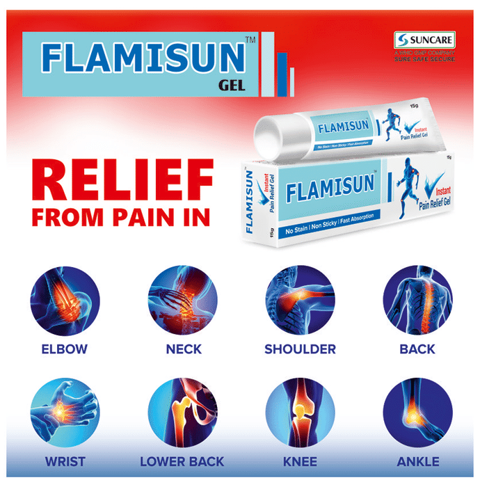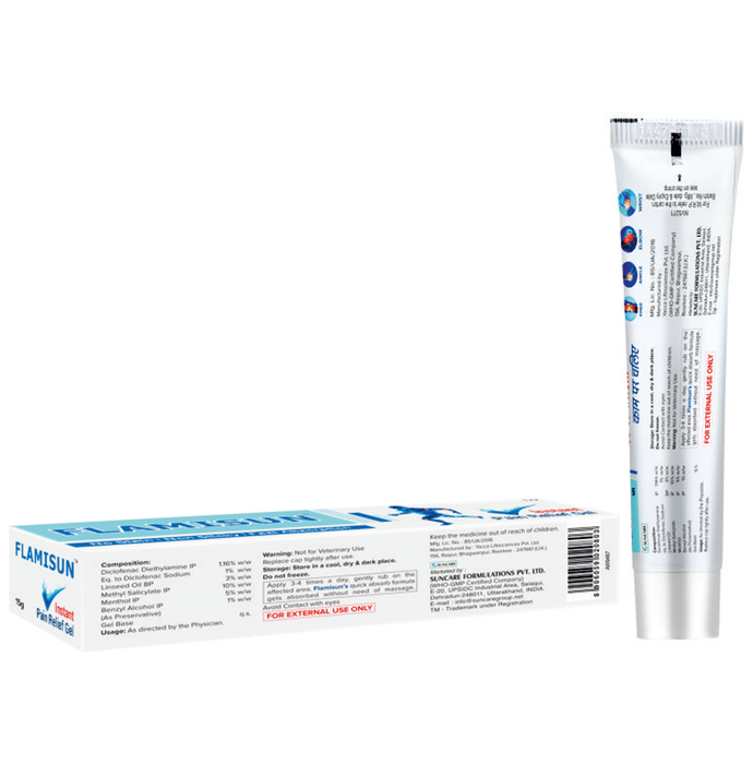 Flamisun Gel is a pain relief gel which provides instant relief from muscle pain strains sprains spasms and cramps. It has been scientifically formulated with ingredients such as Diclofenac Diethylamine Linseed Oil Methyl Salicylate Menthol. It provides effective relief from backache knee pain and shoulder pain. It gets absorbed instantly and provides long-lasting relief from the pain.