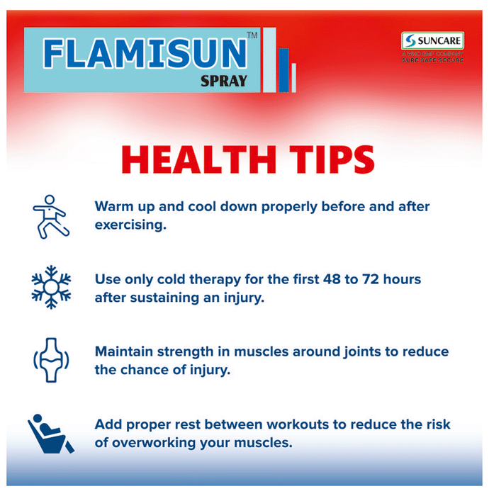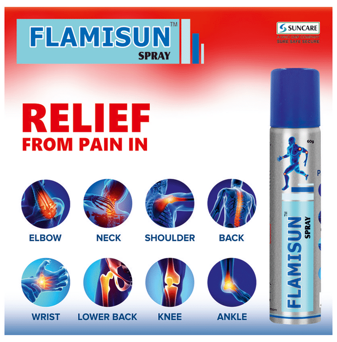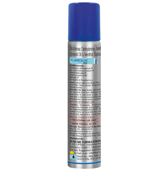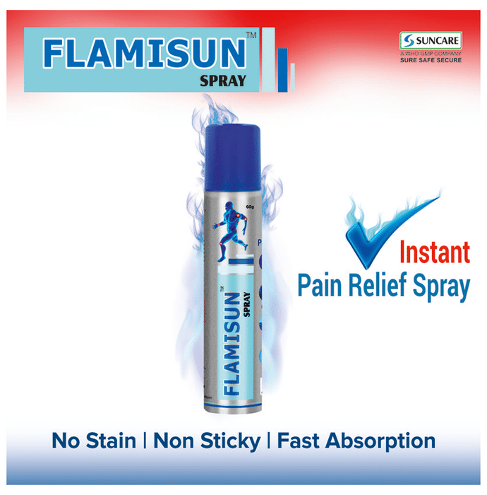 Flamisun Spray is a pain relief spray which provides instant relief from muscle pain sprain and joint pain. It has been scientifically formulated with ingredients such as diclofenac diethylamine linseed oil methyl salicylate and menthol. Flamisun contains micro particles which provide quick and long-lasting relief from pain by penetrating deeply. It is beneficial in case of backache and knee pain.