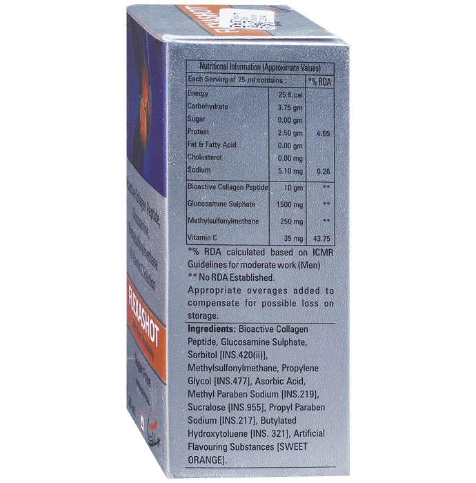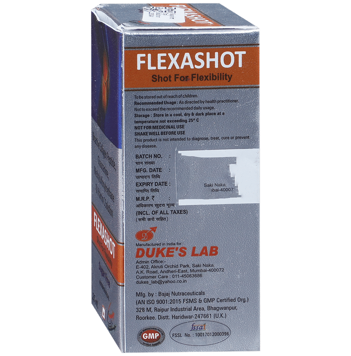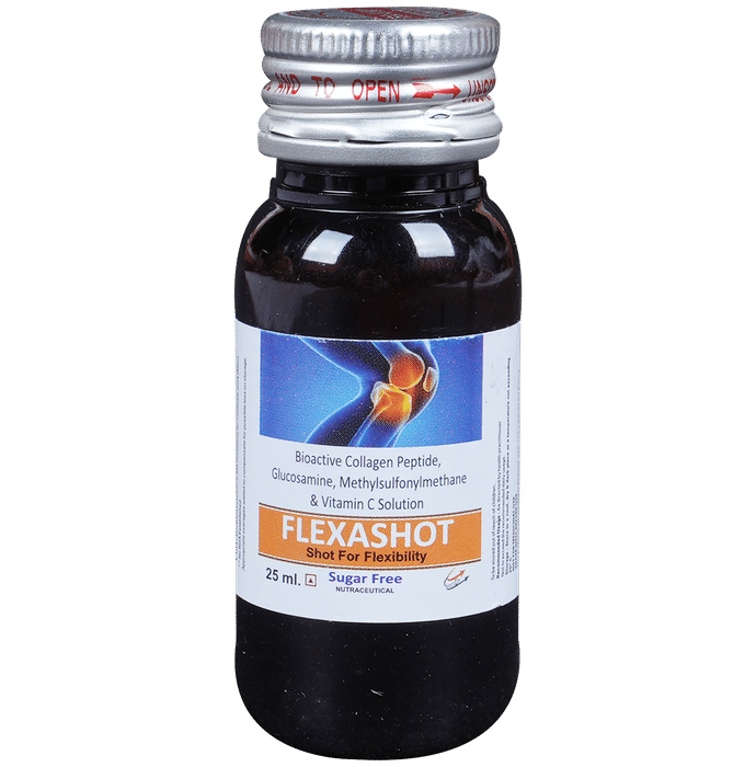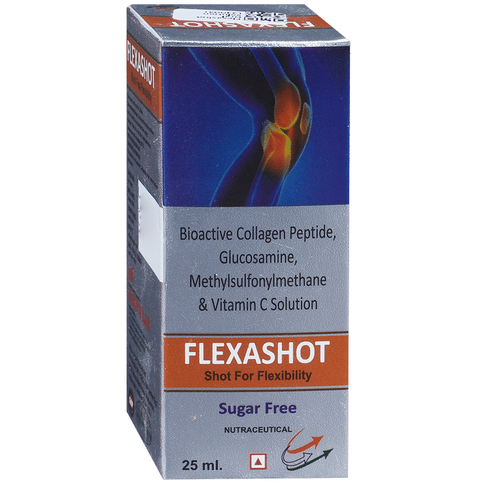 Flexashot Oral Solution is formulated for enhanced flexibility. It contains a bioactive collagen peptide solution derived from collagen which may promote skin elasticity joint health and bone strength. Glucosamine and MSM are often used for joint support with glucosamine aiding joint function and MSM reducing inflammation. Vitamin C acts as an antioxidant supporting the immune system and collagen production for skin health and tissue repair. It's essential to consult with a healthcare professional before using these ingredients as supplements to determine the appropriate dosage and suitability for individual health needs.
