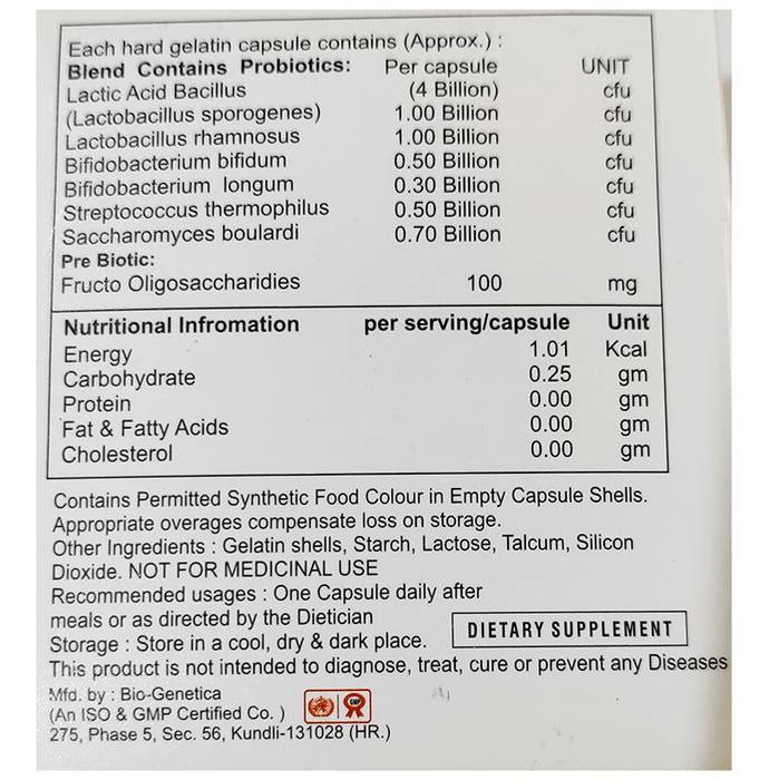 It is a dietary supplement formulated with probiotic and prebiotic strains to support your immune and digestive health|It helps restore the natural balance of good and bad bacteria in the gut and promotes its healthier functioning|Probiotics helps improve the symptoms of irritable bowel syndrome and diarrhoea|Lactobacillus rhamnosus inhibits the growth of harmful bacteria in your intestine and stomach and promotes smooth digestion|Fructo-oligosaccharides help feed the good bacteria and relieve constipation