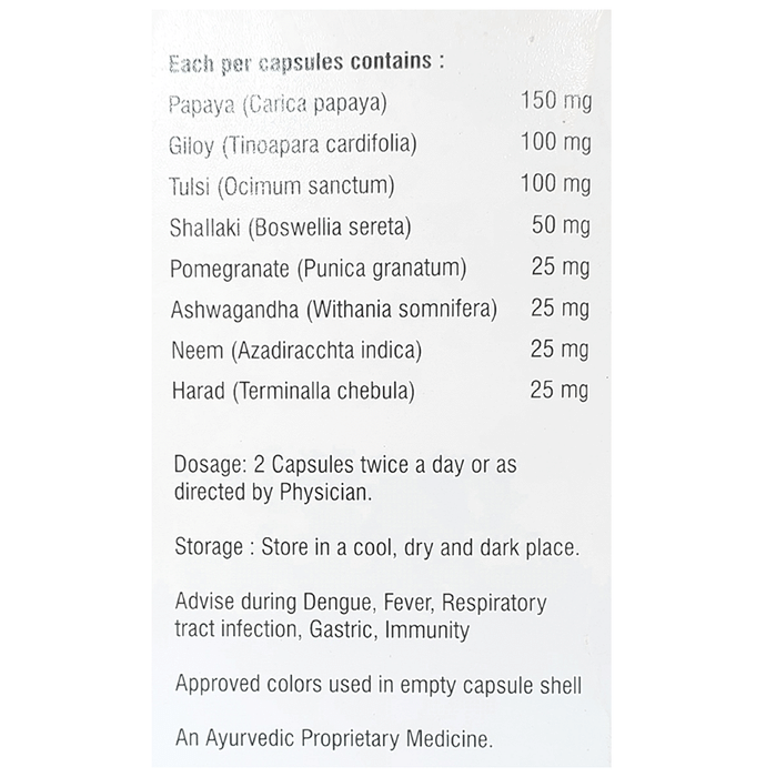 Flusee Capsule contains natural extracts that may help minor issues with dengue fever without any side effects and may prevent other symptoms of fever. It also caters to looking after your overall health and can be administered in case of viral attacks like jaundice or malaria.