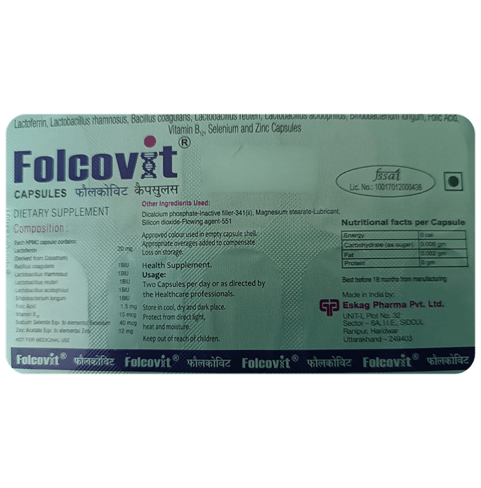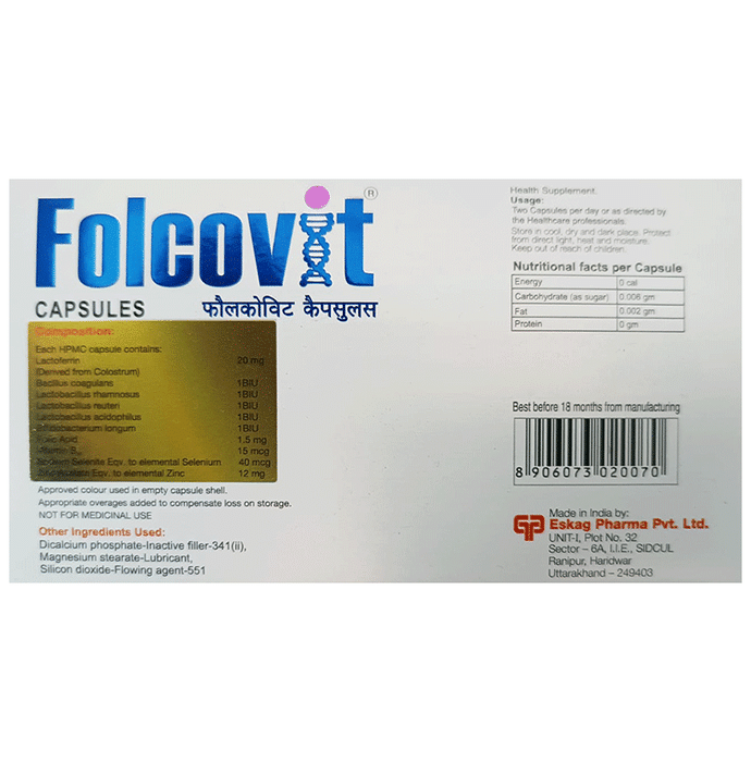 Folcovit Capsules are the Lactic Acid Bacillus sporpgens capsules that helps in restoring gastrointestinal flora and corrects Microfloral Disturbances. Folcovit capsules also contains vitamins such as cyanocobalamine (vitamin B12) and folic acid. Many bacteria and other organisms live in our bodies normally. "Friendly" bacteria such as lactobacillus can help us break down food absorb nutrients and fight off "unfriendly" organisms that might cause diseases such as diarrhea. It also restores the Frequency of Defecation. It is used to treat loose stools (antibiotic associated and traveller?s diarrhoea) and anaemia due to folic acid deficiency. Folcovit Capsules fights against the growth of unwanted bacteria maintaining a healthy balance of microflora in the intestine and helps in Immune system strengthening it also helps in producing and maturing the red blood cells. Use under medical supervision.