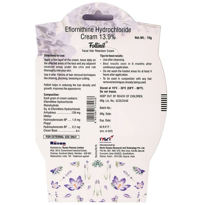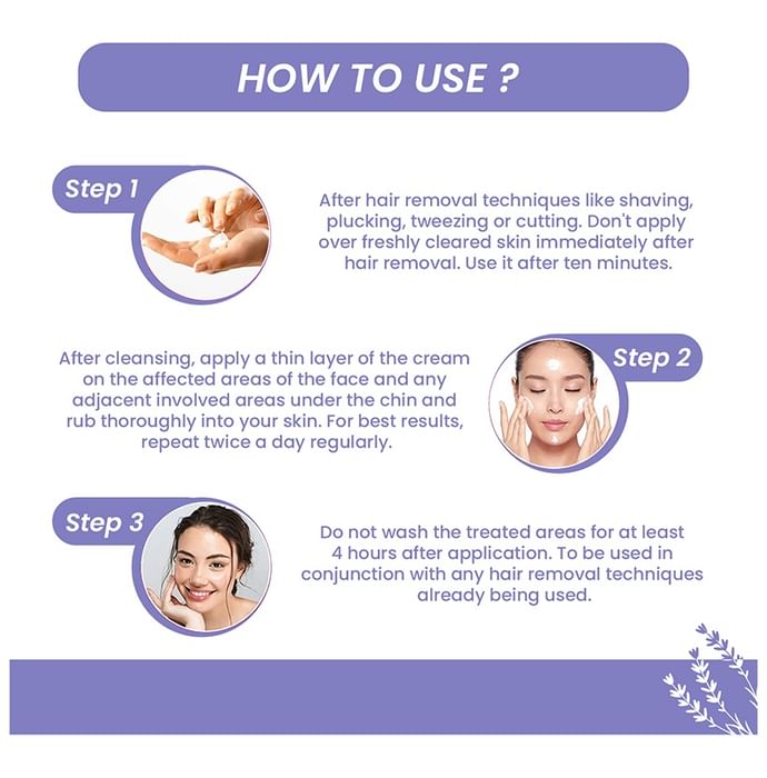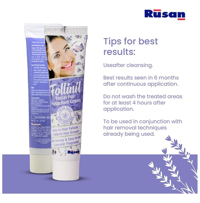 Follinil can be used in conjunction with hair removal techniques like shaving plucking tweezing or cutting (Follinil should be applied atleast 5 mins after hair removal)|Apply thin layer of follinil cream on the affected areas of the face and any adjacent involved areas under the chin|Rub the applied layer thoroughly onto your skin|Use twice daily (at least 8hrs apart or as directed by physician)|Avoid washing the treated areas for at least 4 hours after application|Gradual improvement is seen in 6-8 weeks of application. Continue to use to maintain results|Follinil starts showing its effects from 2months of use (lesser compared to other methods) and is clinically proven to reduce the growth of unwanted hair