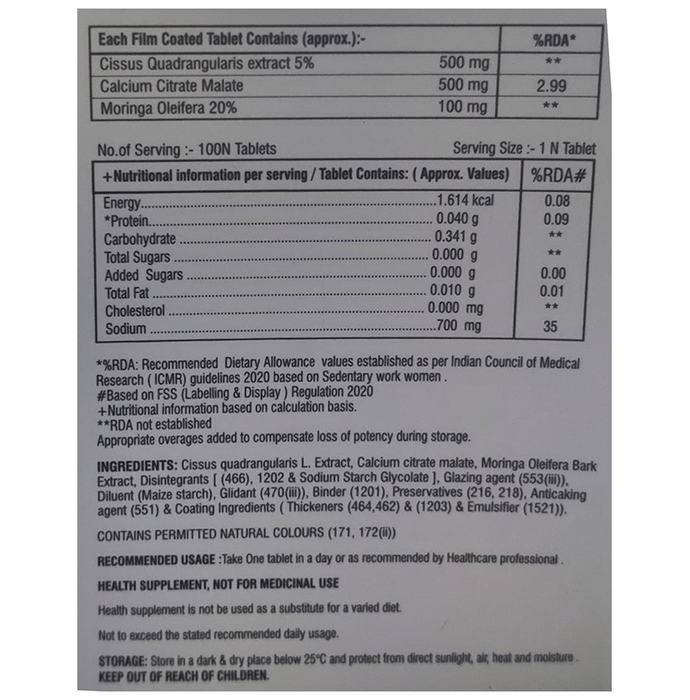 Reduces the risk of calcium deficiency rickets and osteoporosis|Cissus quadrangularis is a therapeutic herb that promotes healing in fractured bones|It has antioxidant analgesic and anti-inflammatory properties|It decreases pain and swelling and improves the rate of healing in people with various types of bone fractures|It quickens healing during bone fracture strengthens bone integrity combats pain and inflammation and assists in building weak bones|It restores the balance between bone restoration and bone formation|It assists in building the chemical composition of fractured and weak bones