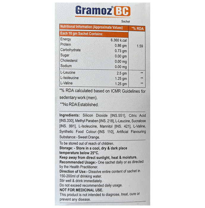 Gramoz BC Sachet Orange Sugar Free & Gluten Free is formulated to promote overall muscle mass and exercise recovery. The capsule may assist in reducing the amount of exercise-induced muscle tissue damage.
