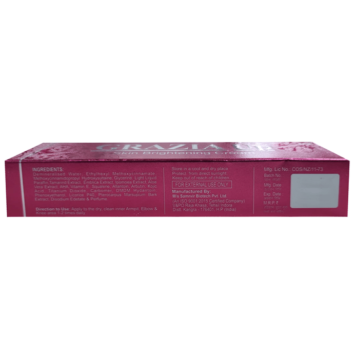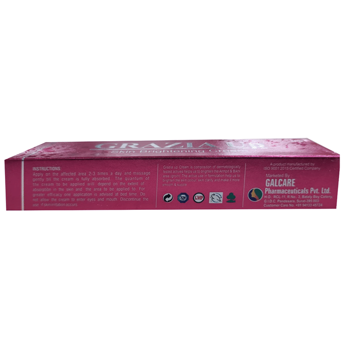 Grazia UP Cream is powered with premium natural ingredients which help to brighten the skin colour and make it more smooth and supple. The active formulation helps to lighten up the dark areas like under eye dark circles armpits elbows upper thigh and neck.
